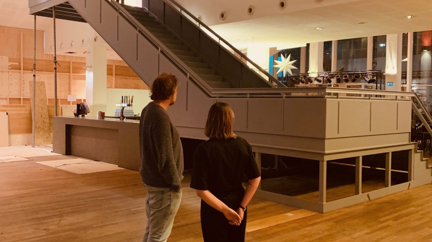 De keuken en bar zijn – op een paar kleine toevoegingen na – klaar en op 6 januari is de nieuwe trap geplaatst. In de maanden februari en maart wordt de foyer verder afgewerkt: missende vloerdelen worden vervangen, de wanden strak getrokken en de eerste contouren van het nieuwe podium worden zichtbaar. In de zomer krijgt de foyer zijn definitieve lichtplan en verplaatsen we de centrale entree van de Otto Reuchlinweg naar de Rijnhavenzijde. Met de overweldigende respons op onze crowdfundingscampagne kunnen we deze zomer het podium van licht en geluid voorzien en hopen we ook een start te maken met een extra lift in de foyer.
